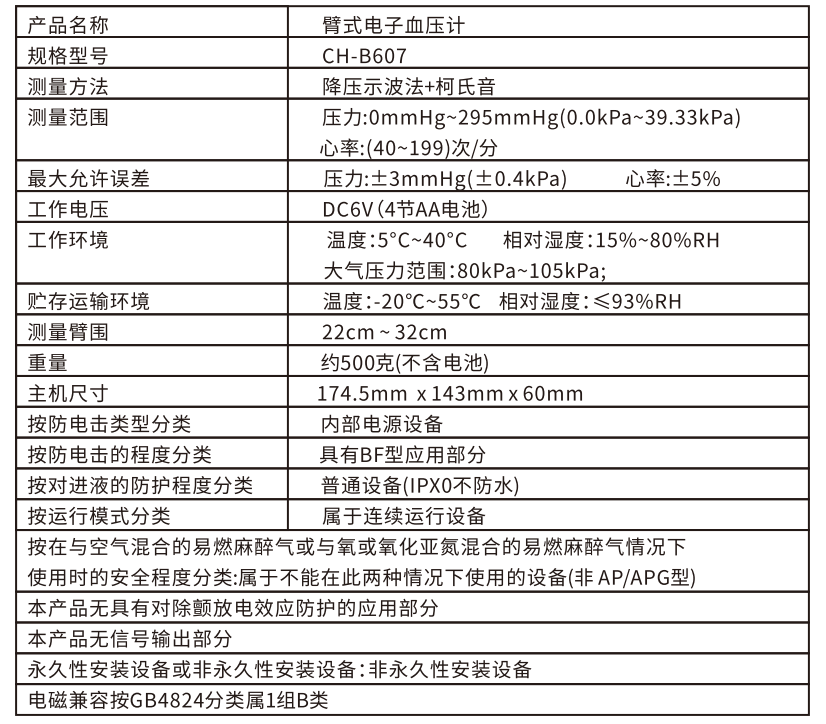 以示波法和柯氏音法两种算法测量成人收缩压、舒张压和脉搏,其数值供诊断参考。